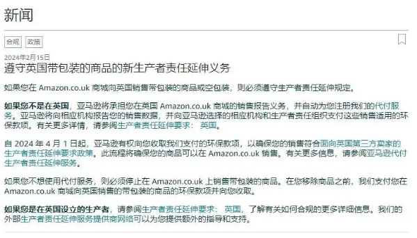 亞馬遜英國站近日發(fā)布消息稱,如果賣家在英國的Amazon.co.uk上銷售包裝商品或空包裝,則必須遵守生產者延伸責任(EPR)。如果沒有在英國成立,亞馬遜將承擔賣家在英國Amazon.co.uk上銷售的報告義務,并自動為賣家報名平臺的代付服務。