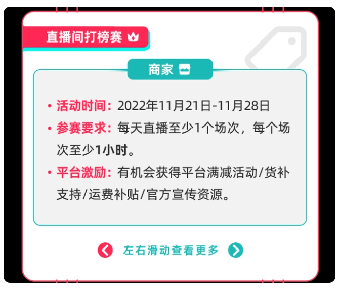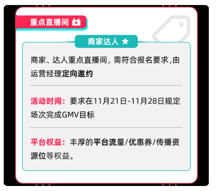 Tik Tok本次黑五政策,將對重點直播間精心扶持,商家,達人重點直播間,需符合報名要求,由運營經(jīng)理定向邀約;只要在活動時間11月21日-11月28日,規(guī)定場次完成GMV目標,即可獲得平臺的權益,獲得豐厚的平臺流量/優(yōu)惠券/傳播資源位等權益。