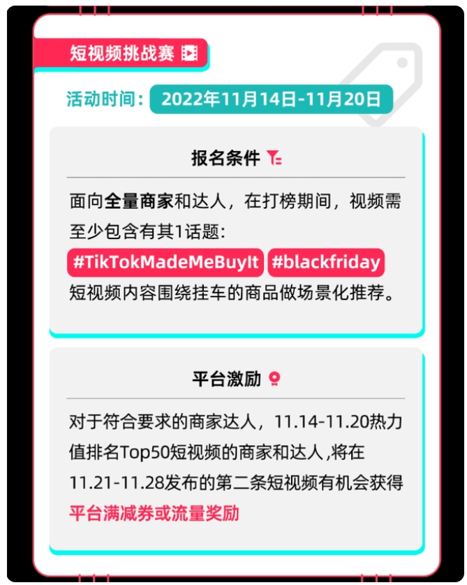 報名條件:面向全量商家和達人,在打榜期間,視頻需至少包含有其1話題:#TikTokMadeMeBuylt或#blackfriday,短視頻內容圍繞掛車的商品做場景化推薦。