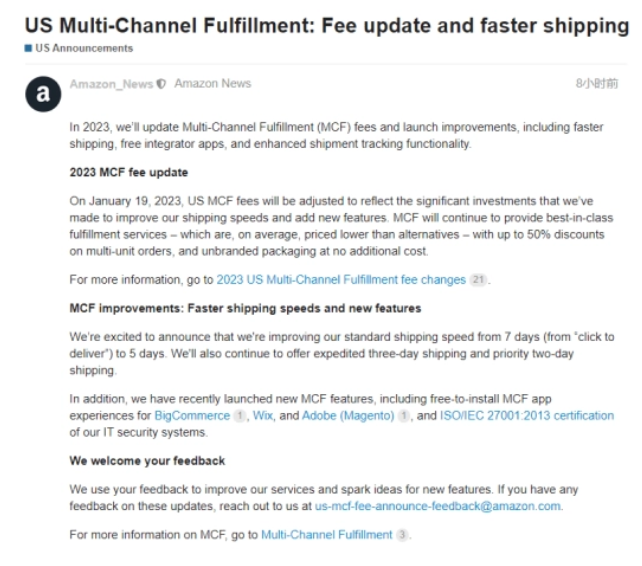 近日,亞馬遜美國站發(fā)布公告稱,2023年1月19日起,將為賣家提供更快的運(yùn)輸速度和免費(fèi)的集成商應(yīng)用程序和增強(qiáng)的貨運(yùn)跟蹤功能,為此將上調(diào)多渠道配送(MCF)費(fèi)用。