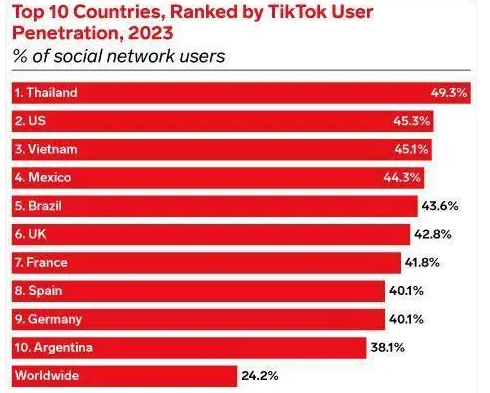 其中,泰國是世界上TikTok使用率最高的國家,高達(dá)近一半的泰國人使用TikTok。美國排名第二,45.3%的社交用戶使用TikTok。
